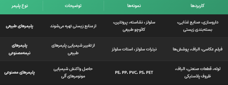 کاربرد: صنعت غذایی، داروسازی، پوشاک، زیستپزشکی. - پلیمرهای مصنوعی (Synthetic Polymers):