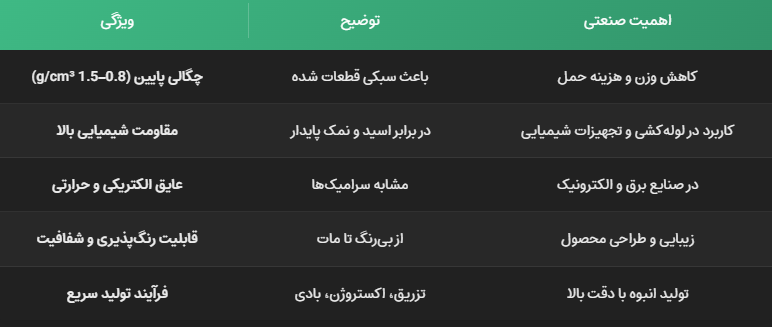 🟢 ویژگی: سبک، قابل ذوب، مناسب برای قالبگیری تزریقی و اکستروژن.