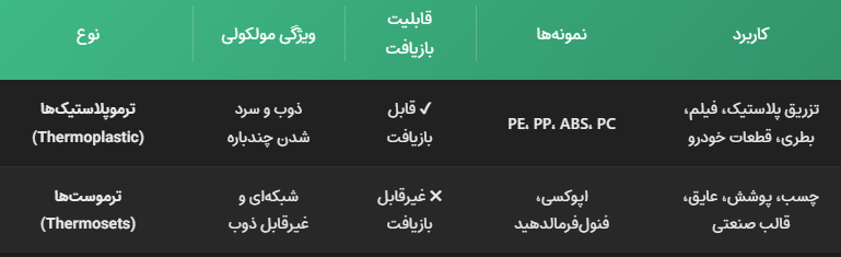 با حرارت دادن ذوب میشوند و با سرد شدن مجدداً سخت میگردند. این خاصیت باعث بازیافت آسان آنها میشود.