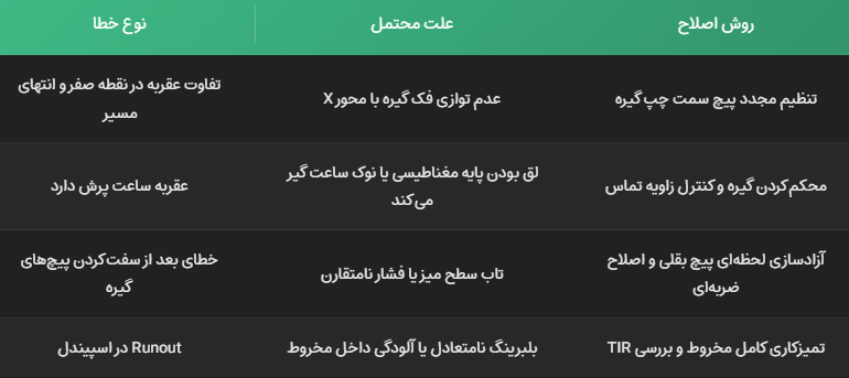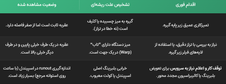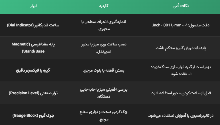 - روش: قرار دادن ساعت روی بلوک ثابت و چرخش دستی اسپیندل؛ انحراف بیش از ۰.۰۱ mm نشانهی مشکل است.