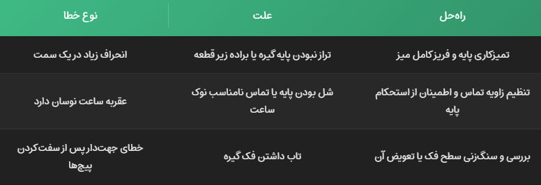 - نکته طلایی (The Golden Rule): بعد از هر تنظیم در یک محور، باید مجدداً ساعت را در نقطه شروع چک کرد، زیرا سفت کردن یک پیچ میتواند بر پیچ دیگر تأثیر بگذارد. همیشه تکرار کنید.